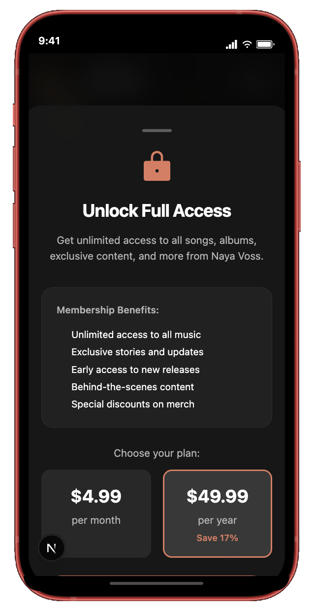 Sell individual tracks and albums as one-time purchases, offer recurring memberships for exclusive content, or combine both. Link to external merch stores and ticket platforms—all with built-in Stripe payment processing.